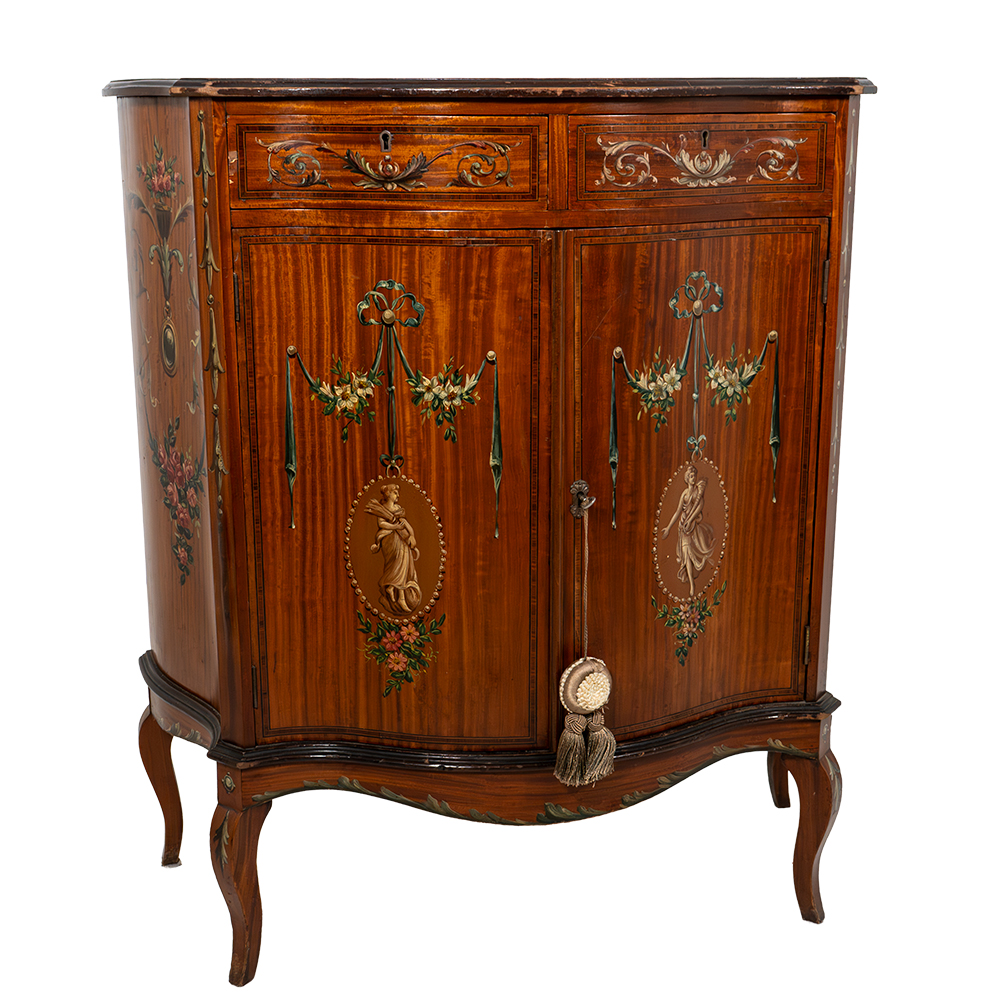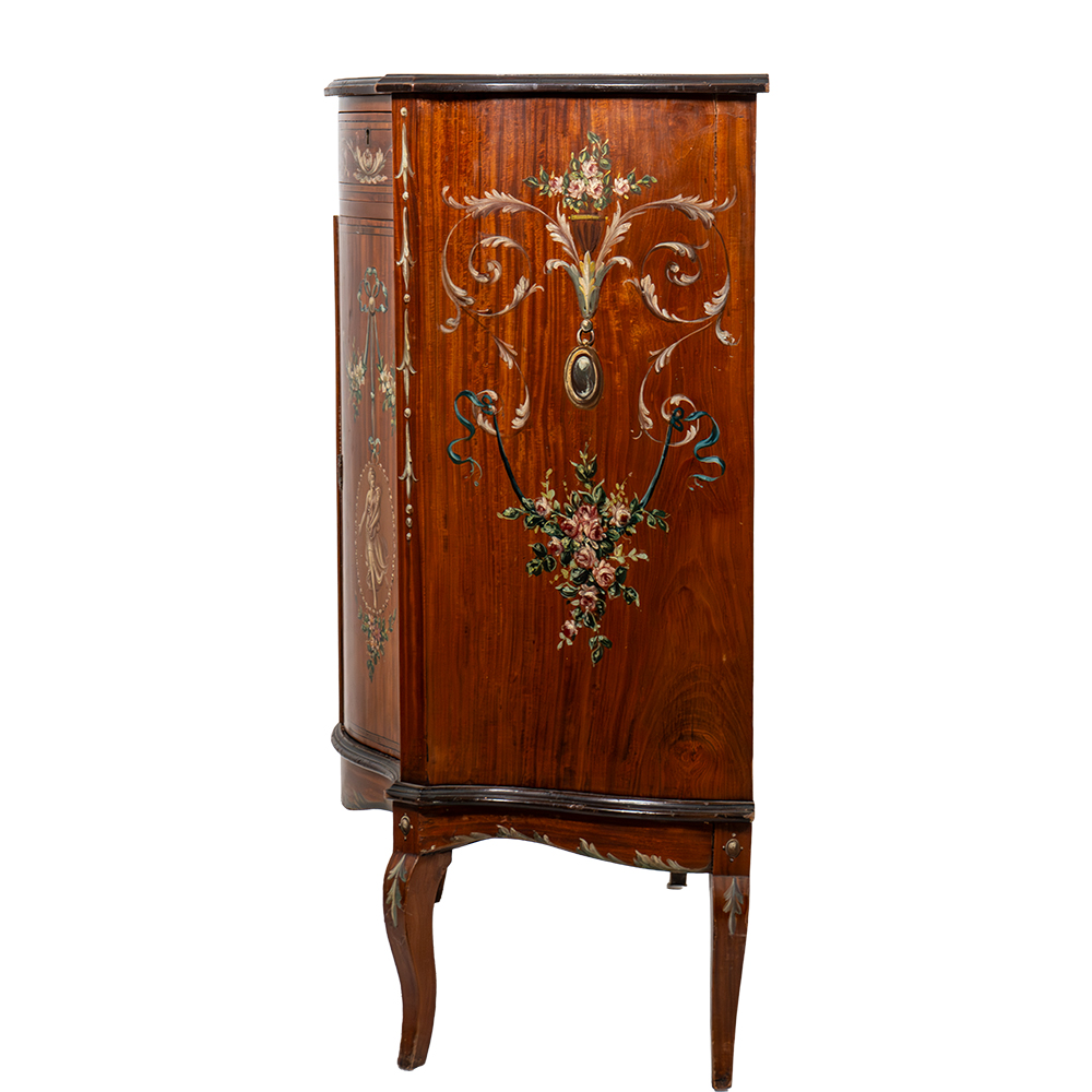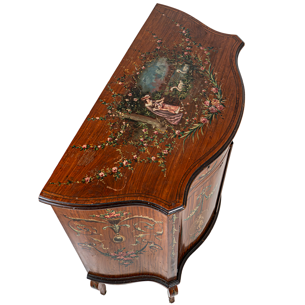 Il mobile presenta una struttura in legno pregiato finemente lucidato, con fronte sagomato e gambe slanciate a cabriole. La superficie è impreziosita da delicate pitture a mano: ghirlande floreali, nastri, pendagli e medaglioni con figure classiche, elementi tipici dell’estetica Sheraton.